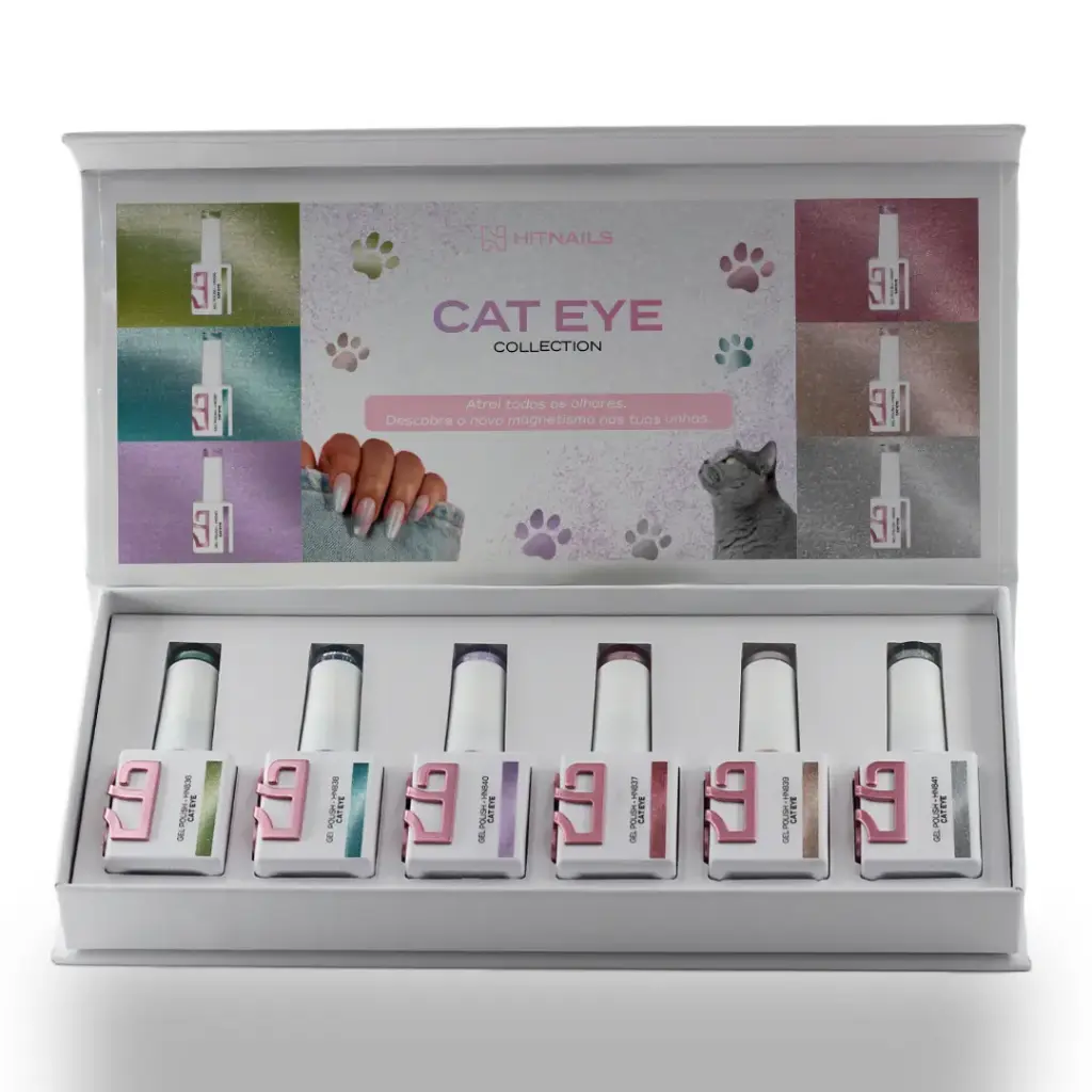 Estojo branco com seis frascos de verniz para unhas da coleção CAT EYE e design com patas de gato e imagem de gato cinza